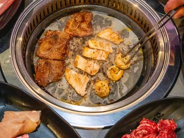 Select from an incredible variety of meats — including marinated short rib, thin-sliced pork belly, spicy chicken, shrimp, and more.