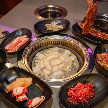 At Hot Pot 585, every table features a built-in grill so you can sizzle, flip, and sear your favorite meats to perfection.